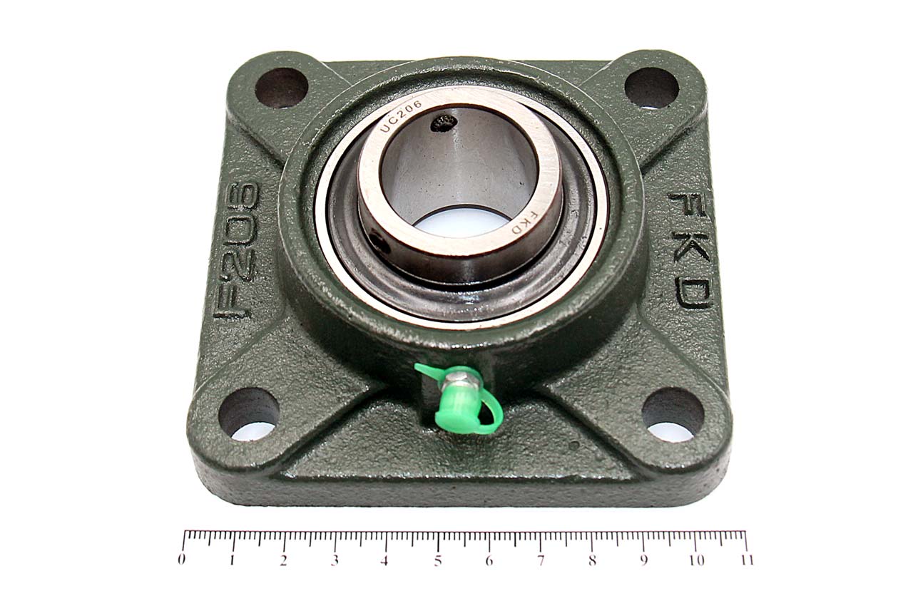 Международное обозначение: UCF 206Подшипник UC:Внутренний диаметр: 30 ммНаружный диаметр: 62 ммШирина: 38.1 ммСепаратор: стальнойДинамическая грузоподъемность: 14500 HСтатическая грузоподъемность: 11200 HПредельная частота вращения: 2800 об/минКорпус F:Материал: серый чугун НТ200Болт: М10Расстояние между центрами установочных отверстий подушек, e: 83 ммТип: фланцевыйОписание: Подшипник шариковый радиальный однорядный с двумя уплотнениями, широким внутренним кольцом и установочным винтом во внутреннем кольце. Подшипник является самоцентрирующимся (самоустанавливающимся), так как корпус имеет сферическое посадочное отверстие, а сам подшипник сферическое наружное кольцо, что позволяет подшипнику слегка перемещаться в корпусе компенсируя перекос вала.Подшипник имеет отверстия и канавку для смазки, корпус комплектуется пресс-маслёнкой. Направление воспринимаемых нагрузок - радиальное и осевое в обе стороны. Монтаж на валу удобен и прост. Установлен в корпус F фланцевого типа.