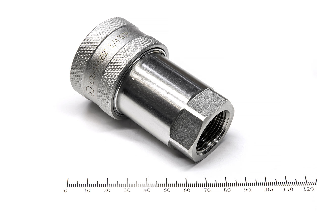 БРС ISO-A G 3/4" розетка (LSQ-S1-06SF-BSP3/4)Запорная система: тарельчатый клапанФиксация системы: шариковый подшипникУсловный проход: 3/4" (20 мм)Номинальный поток: 127.3 л/минНоминальное давление: 30 МПаРабочая температура: от -20°С до +120°CСоединение полумуфт: без давленияПрисоединительная резьба: BSP3/4Материал полумуфт: углеродистая стальМатериал уплотнений: NBRКлапан ISO- A имеет шариковую фиксацию полумуфт, двухсторонний клапан внутреннюю резьбу.Конструктивные особенности БРС серии LSQ-ISOA :- Новая конструкция клапана позволяет выдерживать перегрузки высокого давления потока рабочей жидкости, обеспечивая при этом высокую производительность- Тарельчатая форма клапанов предотвращает утечки- Рабочие поверхности закалены для повышения стойкости- Фиксирующий механизм удерживает разъемные части на стыке- Присоединительные части разъемов дополнительно прошли механическую обработку- Улучшенное хромированное антикоррозионное покрытие
