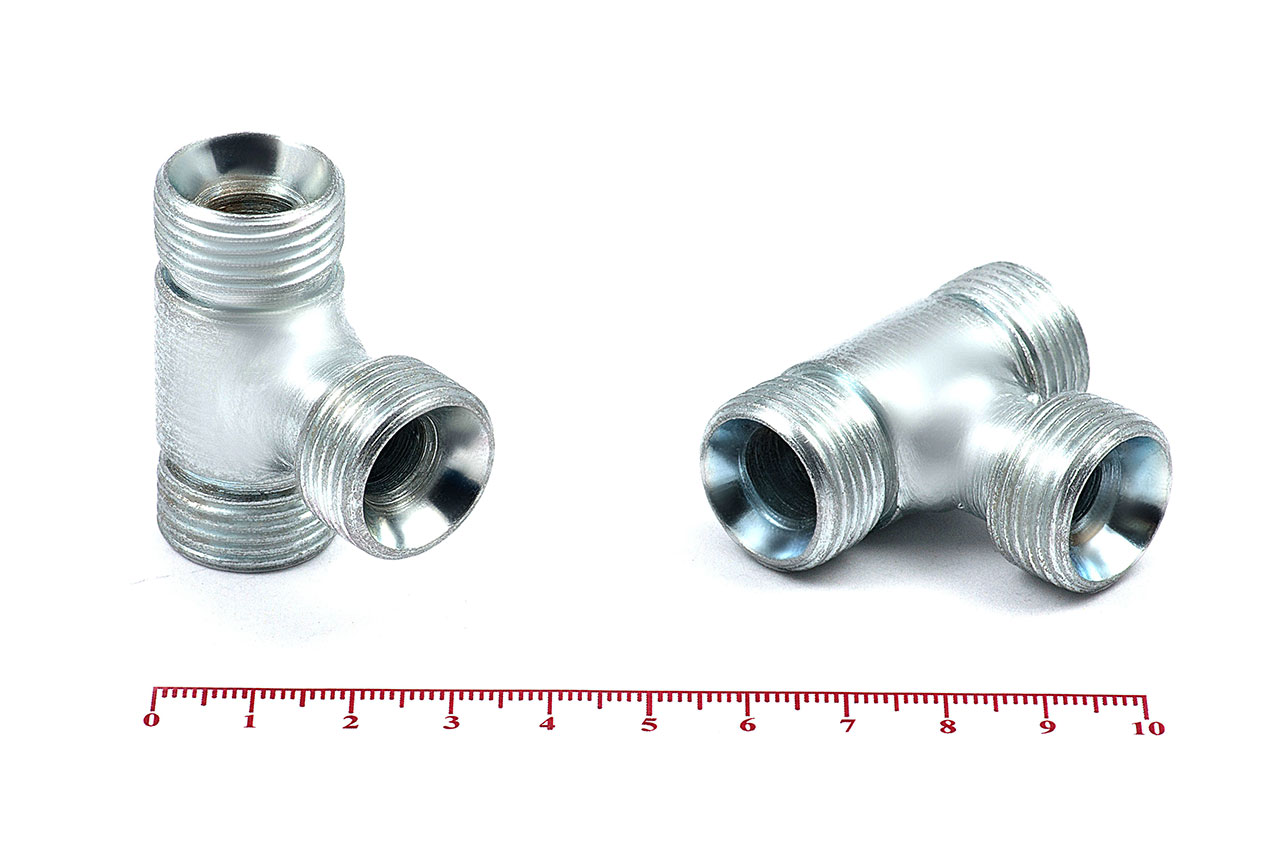 Тройник проходной с наружной резьбой для соединения рукавов высокого давления между собой, а также для присоединения РВД к насосам, гидроцилиндрам, гидроусилителям по внутреннему конусу. Предназначены для разделения непрерывного рабочего потока на несколько разнонаправленных ветвей.Ключ под гайку: 24Наружный диаметр труб: 14 ммВнутренний диаметр: 10 ммРезьба метрическая цилиндрическая: М20х1.5Материал: 35 сталь, покрытие цинковое 9 мкм с хроматированиемТемпература рабочей среды:-бензин от -40°C до +25°C-керосин, гидравлические и моторные масла на нефтяной основе и их заменители от -40°C до +100°C-вода и водомасляная эмульсия от +5°C до +93°CШтуцеры соединительные характеризуются:-высокая прочность и надежность конструкции-устойчивостью к нагрузкам и вибрациям-устойчивостью к коррозии и окислению-устойчивость к температурам и давлению-устойчивость к сложным внешним условиям-длительный срок эксплуатации